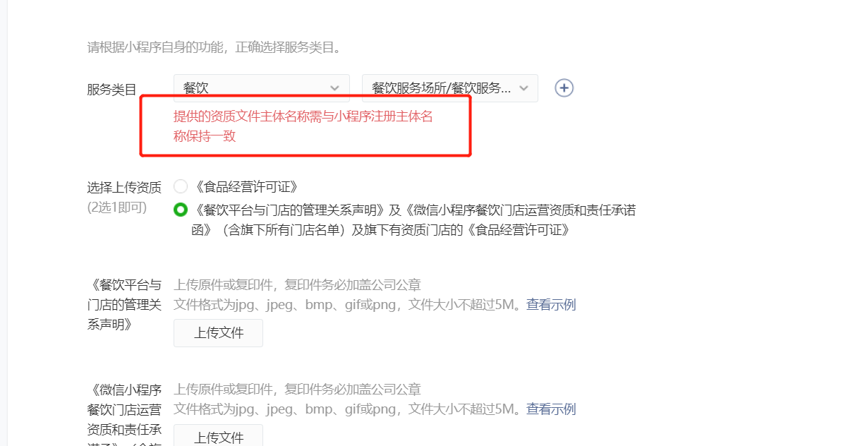 我们主体没有食品经营许可证,我们旗下门店有,我是选择的第二项,上传的是这三个文件,想问下哪里不符合规定?主体没有食品经营许可证,如何与小程序注册主体保持一致?