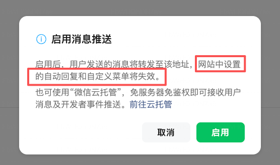 启用消息推送后就无法在MP后台配置自定义菜单和自动回复,你在启用消息推送的时候也有提示呀。