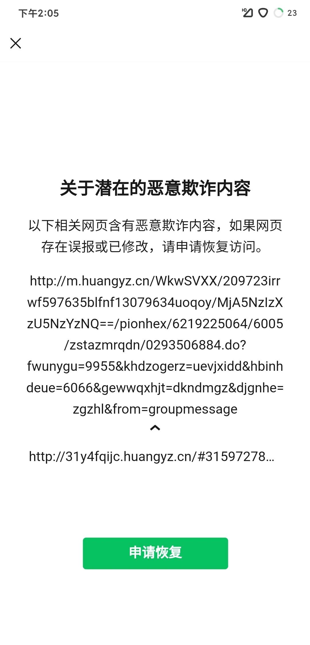 你好,经核实域名huangyz.cn下的链接【http://31y4fqijc.huangyz.cn/#31597278190601】的内容违反《微信外部链接内容管理规范》,现经核实相关违规内容已修改,现予已恢复微信内直接访问的服务,请耐心等待,另核实该域名存在安全漏洞,建议修复相关漏洞,避免再次违规,请知悉。