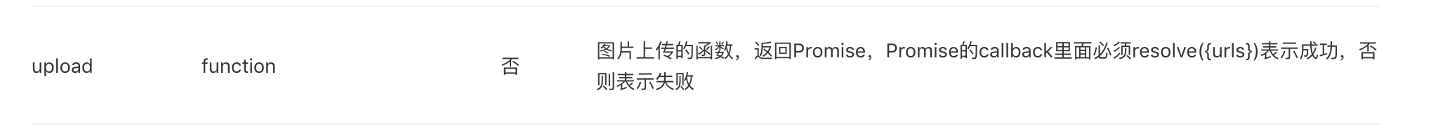 uplaodFile(files) { console.log('upload files', files) // 文件上传的函数,返回一个promise return new Promise((resolve, reject) => { setTimeout(() => { reject('some error') }, 1000) }) }, |