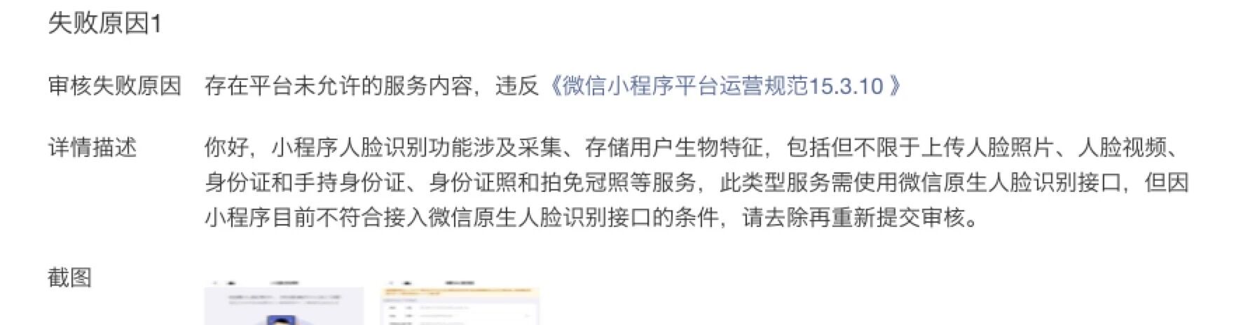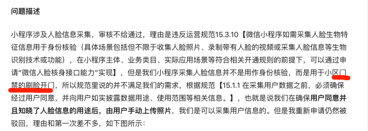 小程序涉及人脸信息采集,审核不给通过,理由是违反运营规范15.3.10【微信小程序如需采集人脸生物特征信息用于身份核验(具体场景包括但不限于收集人脸照片、录制带有人脸的视频或采集人脸信息等生物识别技术或功能),在小程序主体、业务类目、实际应用场景等符合相关开通规则的前提下,可以通过申请“微信人脸核身接口能力”实现】,但是我们小程序采集人脸信息并不是用作身份核验,而是用于小区门禁的刷脸开门,所以规范里说的并不满足我们的需求,根据规范【15.1.1 在采集用户数据之前,必须确保经过用户同意,并向用户如实披露数据用途、使用范围等相关信息。】,也就是说我们在确保用户同意并且知晓了人脸信息的用途后,由用户手动上传照片,我们是可以采集用户信息的。但是我重新申请仍然被驳回,理由和第一次差不多,如下图所示: