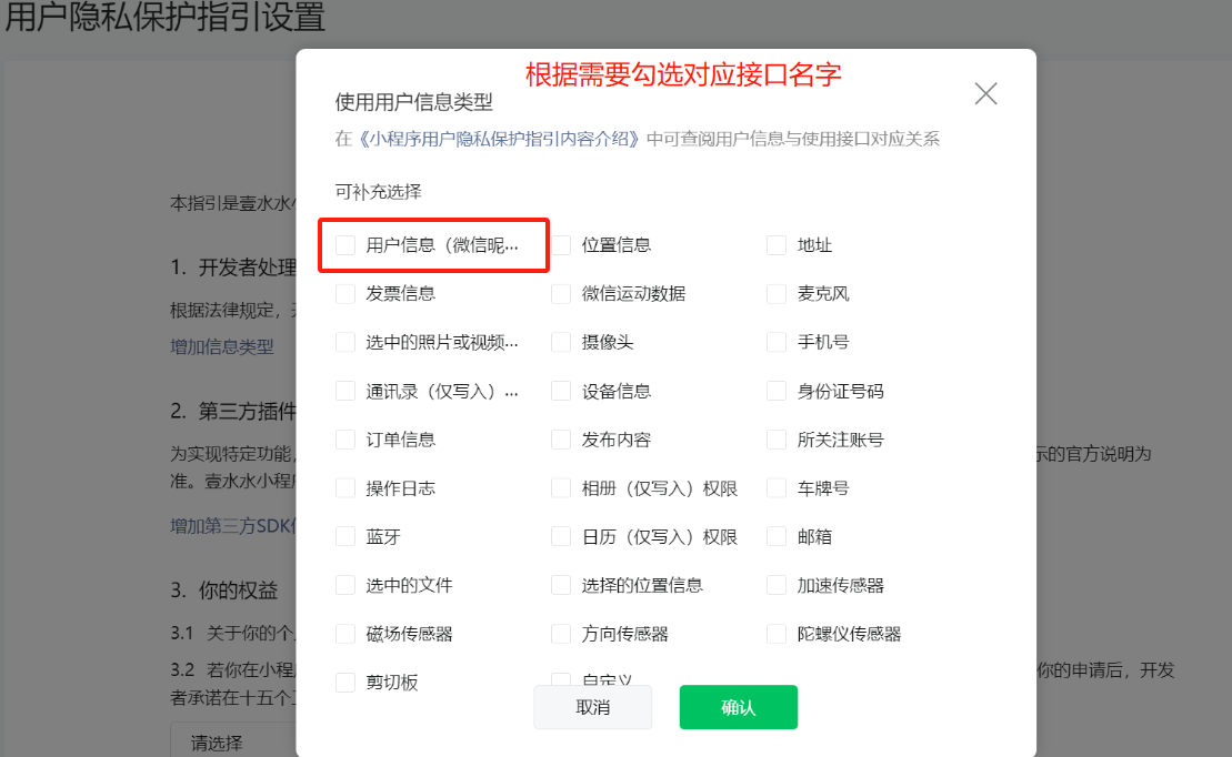 在[mp后台 -> 设置 -> 服务内容声明 -> 用户隐私保护指引]中声明收集小程序所调用的接口/组件对应的隐私类型
