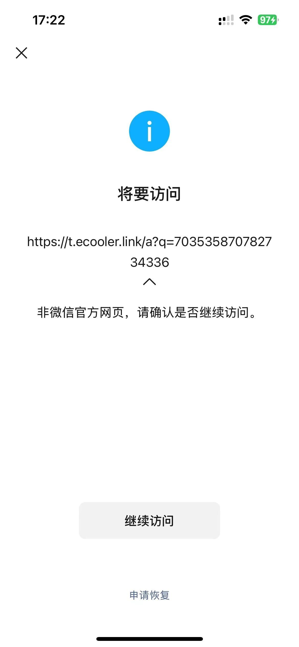 昨天一切正常,今天上午开始无法跳转到小程序,提示“非微信官方网页,请确认是否继续访问”。