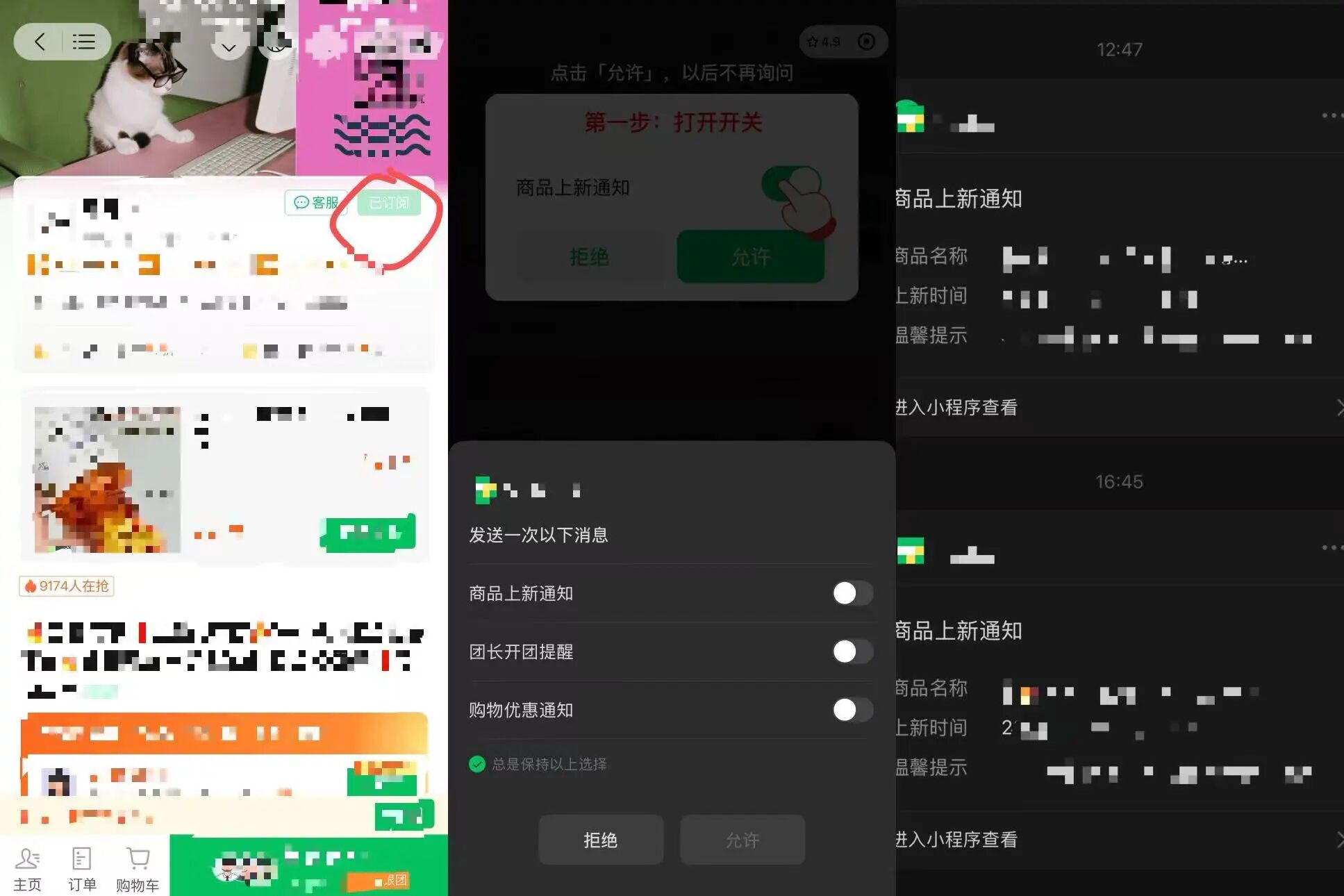 “就可以一只接收到这个团长的上新提醒”,你只收看,不点击打开小程序,试试,过一阵子应该收不到了。