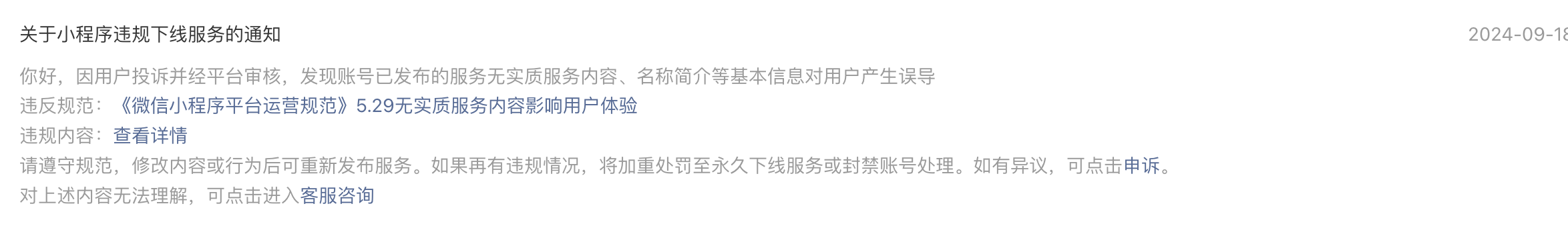 麻烦看一下这个小程序按照要求丰富了页面功能,小程序已稳定运行2个月了,突然说误导用户被暂停了!