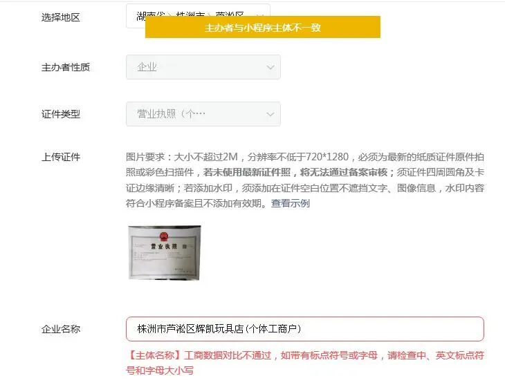 以前的营业执照名称是空白,今天去工商局更改了名称,小程序备案还是不能通过,麻烦大家帮我看看是什么原因