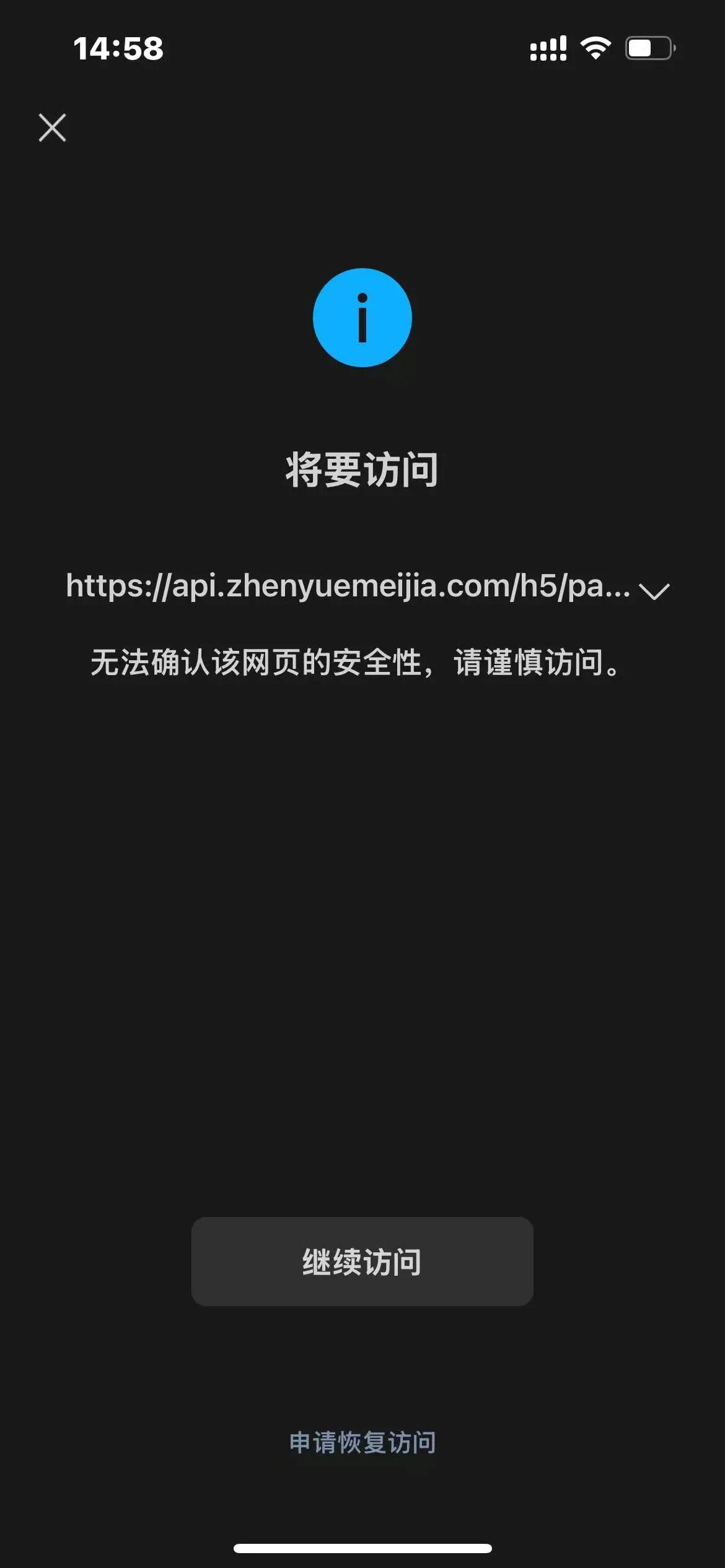 你好,经审核,域名【zhenyuemeijia.com】下的链接【https://api.zhenyuemeijia.com/h5/pages/my/my】的内容存在违反《微信外部链接内容管理规范》的第2.1条“诱导分享类内容”,请对相关内容修改后进行申诉;申诉方式可点击停止访问页底部入口进行操作,我们会在三个工作日处理,请耐心等待。