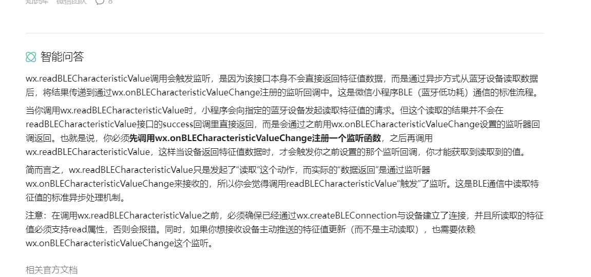 调用wx.readBLECharacteristicValue成功回调没有数据,但是却在wx.onBLECharacteristicValueChange回调返回了数据,不是应该在wx.readBLECharacteristicValue成功回调返回数据的吗?我在你们社区咨询返回下面截图的回去,现在是不从wx.readBLECharacteristicValue成功回调返回数据是吗