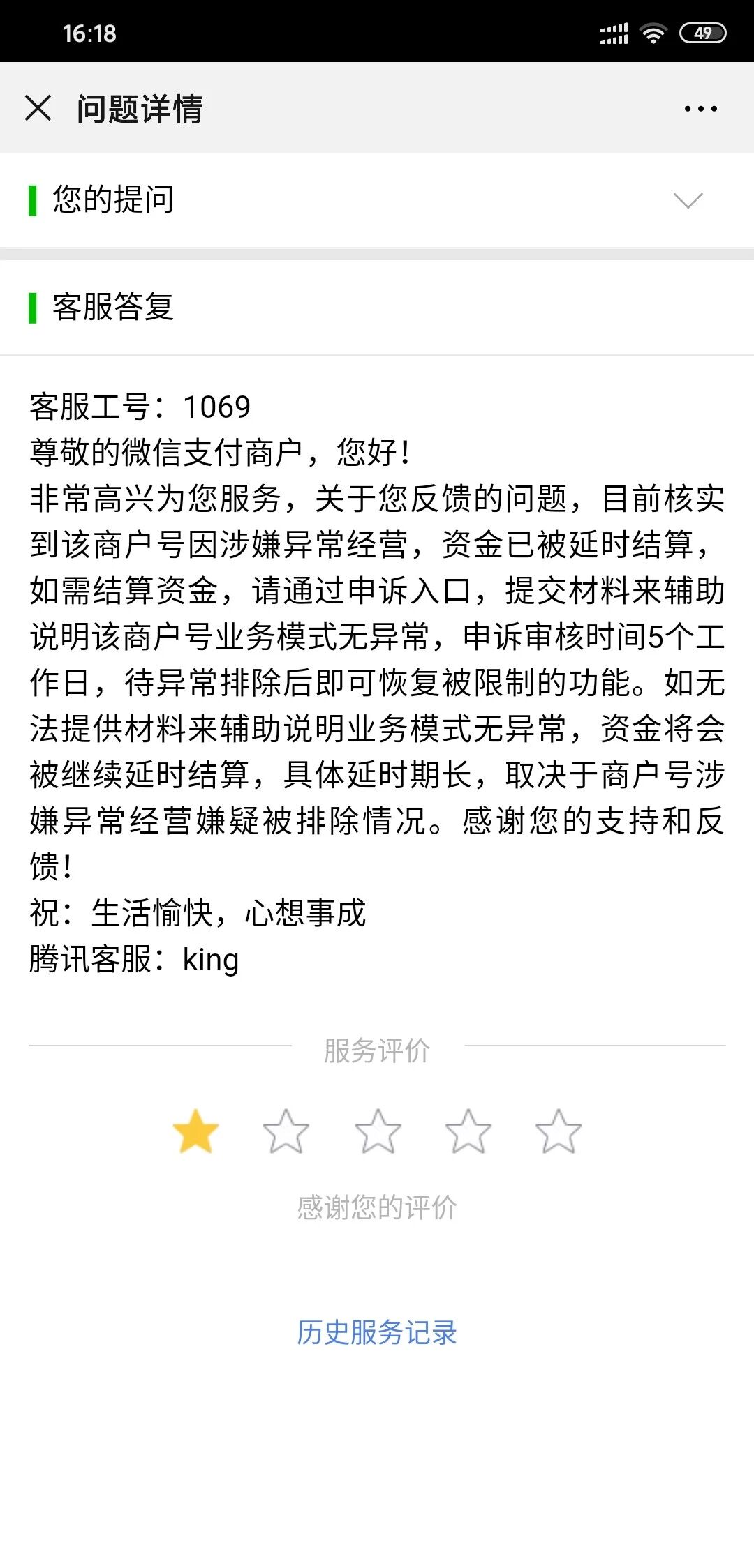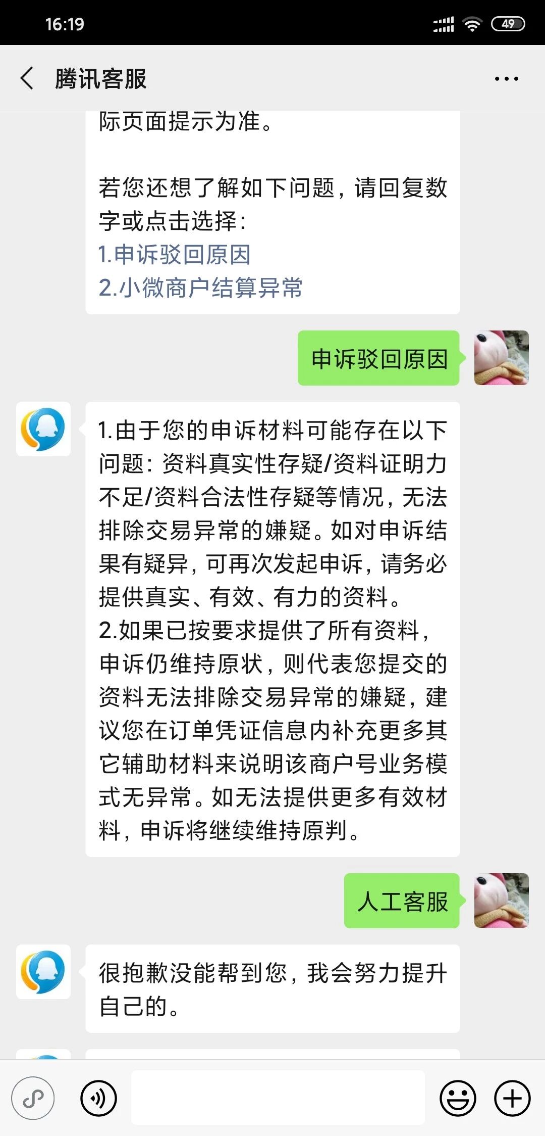 自己看图吧! 选择你们腾讯是因为你们是大平台,而且你们收的利率0.6%, 不低了吧。谁曾想异常了就一直叫申诉。申诉也不通过,维持原判!?你们法院呢??再申诉又要填一大推资料跟信息,算了越说越气,你们的电话95017永远是机器人。