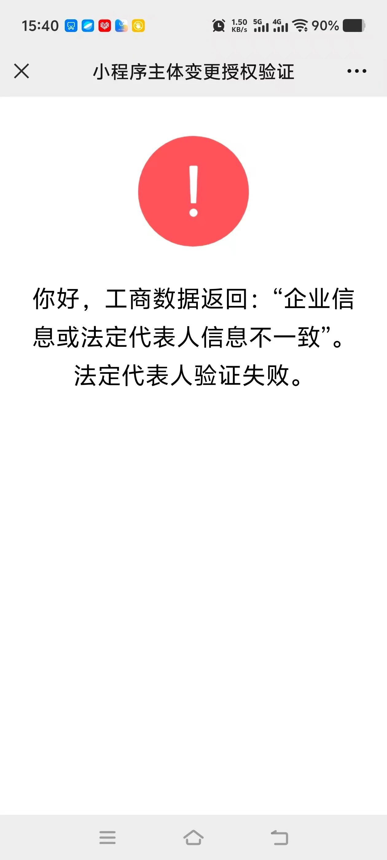 小程序是奶茶店使用的点餐小程序,收款什么的都有,关联到美团收银系统的,原来的认证主体是个体工商户,现在变更成了企业,营业执照名称也变更了,但是统一社会信用代码和法人以及公司地址没有变更,我做了小程序主体变更,第三步授权验证时原主体法定代表人扫码验证提示工商数据返回,企业信息或法定代表人信息不一致,验证失败