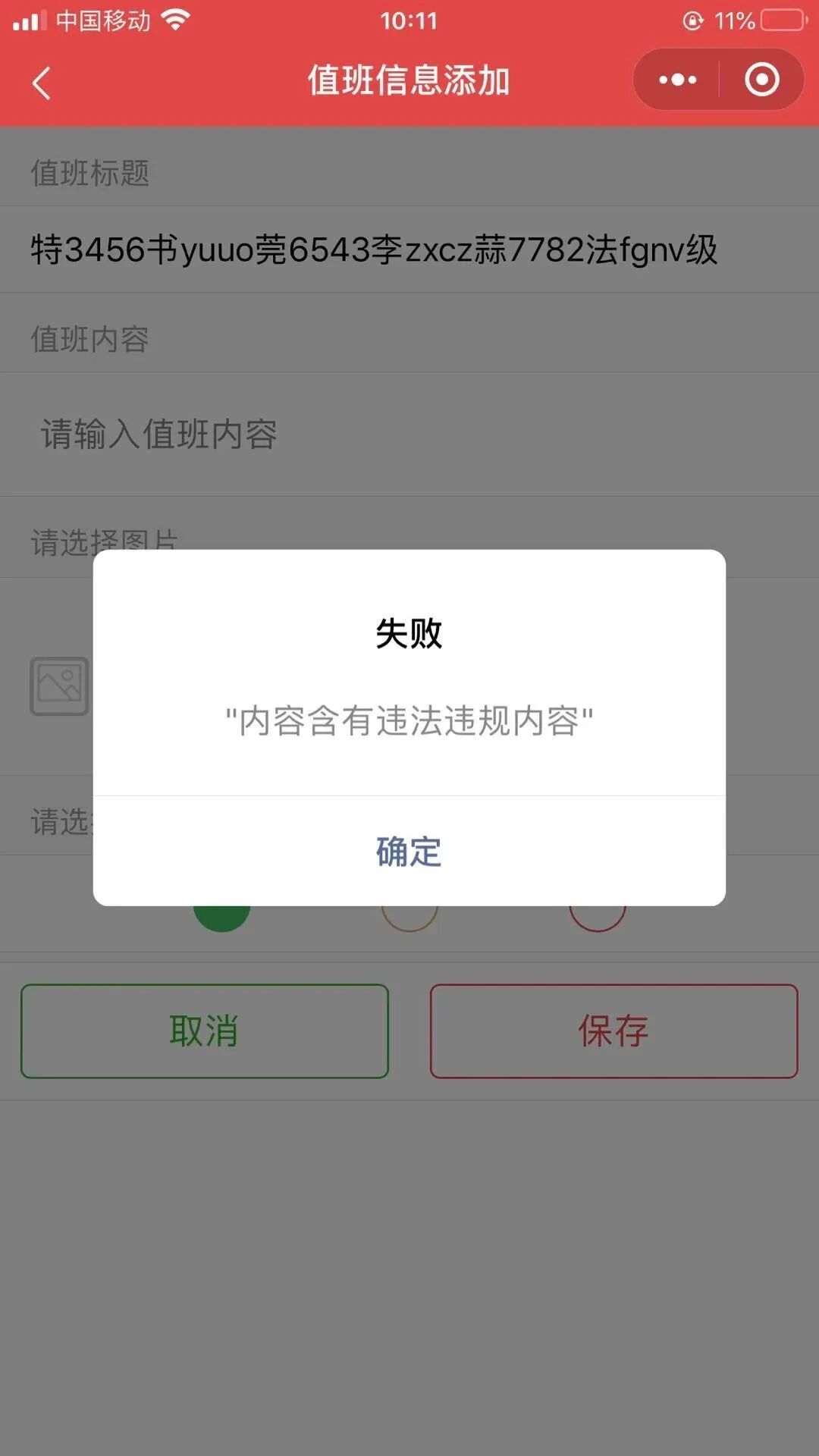你好,经核实,你的帐号(值班组-可上传输入违规敏感信息-并且编辑中可分享至好友-分享卡片可显示违规内容)确实存在涉嫌未设置过滤违法、违规等不当信息内容的机制,请自觉遵守国家相关法律法规,不从事违法或违反《微信小程序平台运营规范》及相关规则的内容和行为,谢谢。