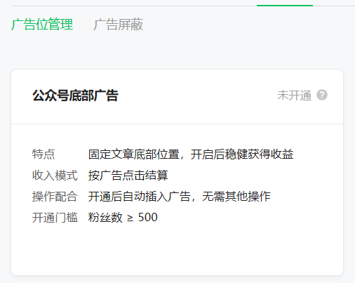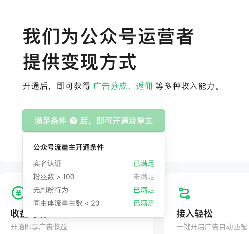 你好,公众号关注用户达到 100 人(可开通公众号返佣商品能力),关注用户达到500人(可开通公众号程序化广告能力)。