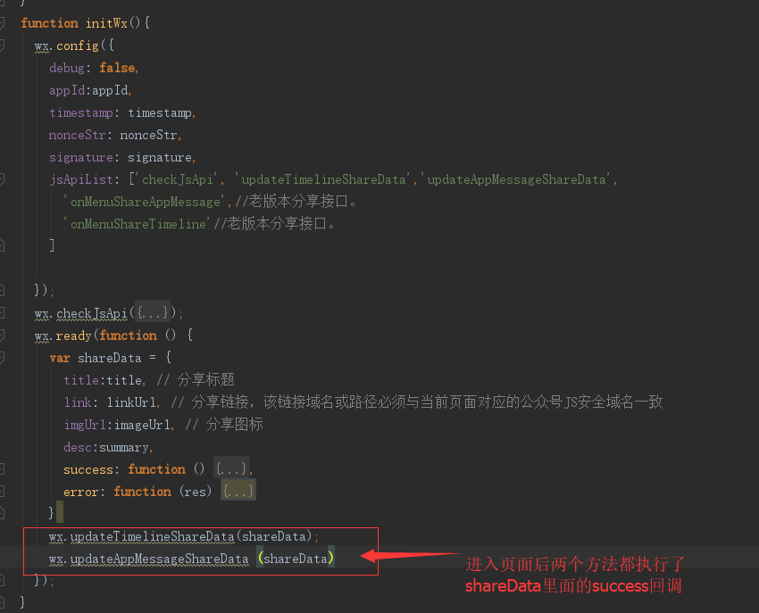 <script src="http://res.wx.qq.com/open/js/jweixin-1.4.0.js"></script><script type="text/javascript"> var moduleType; var title; var imageUrl; var summary = ""; try{ moduleType = '1'; title = 'title'; imageUrl = 'https://mmbiz.qlogo.cn/mmbiz_png/vWapFG3ce1NwsHCcecXbI2BeojwRfmBuYWK5R3alkHfD7cibffDibfsTmPp2y96zyfthI9AanGs2lE5j1GO7PPDw/0?wx_fmt=png'; summary = 'summary'; }catch (e) { alert("获取内容出错") } var appId = 'xxx'; var timestamp = ''; var nonceStr = ''; var signature = ''; initWx(); function initWx(){ wx.config({ debug: false, appId:appId, timestamp: timestamp, nonceStr: nonceStr, signature: signature, jsApiList: ['checkJsApi', 'updateTimelineShareData','updateAppMessageShareData', 'onMenuShareAppMessage',//老版本分享接口。 'onMenuShareTimeline'//老版本分享接口。 ] }); wx.checkJsApi({ jsApiList: [ 'updateTimelineShareData','updateAppMessageShareData', 'onMenuShareAppMessage',//老版本分享接口。 'onMenuShareTimeline'//老版本分享接口。 ], // 需要检测的JS接口列表,所有JS接口列表见附录2, success: function(res) { // 以键值对的形式返回,可用的api值true,不可用为false // 如:{"checkResult":{"chooseImage":true},"errMsg":"checkJsApi:ok"} },error: function (res) { alert('分享异常') } }); wx.ready(function () { var shareData = { title:title, // 分享标题 link: linkUrl, // 分享链接,该链接域名或路径必须与当前页面对应的公众号JS安全域名一致 imgUrl:imageUrl, // 分享图标 desc:summary, success: function () { // 用户点击了分享后执行的回调函数 window.location.href='http://www.baidu.com' }, error: function (res) { console.log('分享异常') console.log(res) } } wx.updateTimelineShareData(shareData); wx.updateAppMessageShareData (shareData) }); }</script>