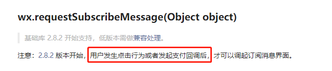 支付回调,wx.requestSubscribeMessage可以wx.requestPayment回调里使用,经过测试可行
