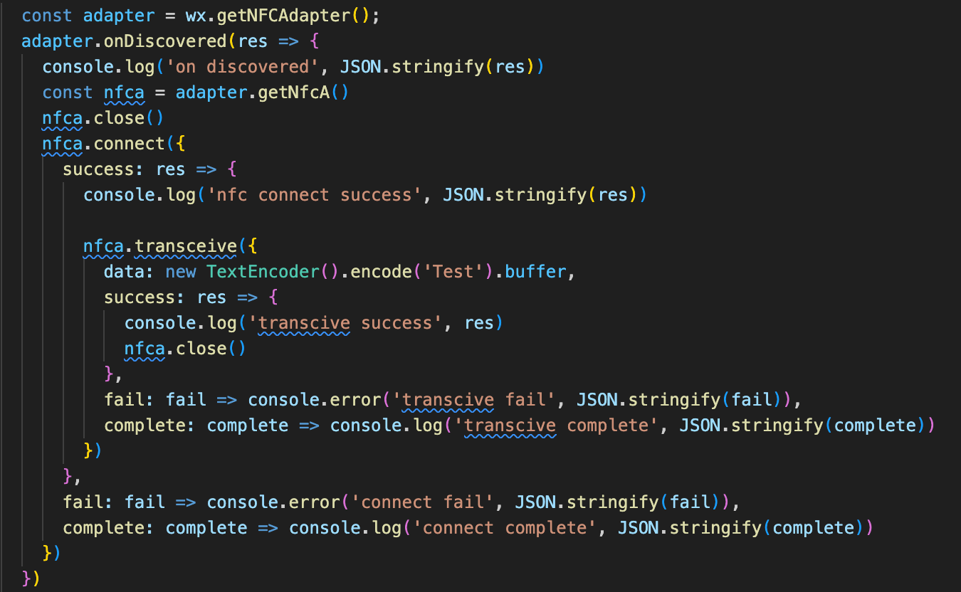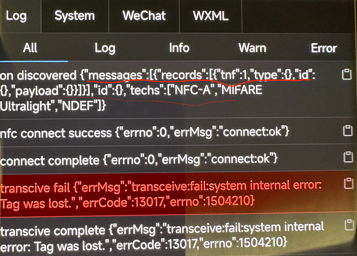按着文档(https://developers.weixin.qq.com/miniprogram/dev/framework/device/nfc.html)写了这么些代码,但是返回messages里面也没有数据。这个比较头秃。然后ndef.writeNdefMessage或者nfca.transceive 好像也都报错(好像是我买的nfc卡片问题)。读不出来东西,这个不知道怎么解决。(已经解决,逐条decode)