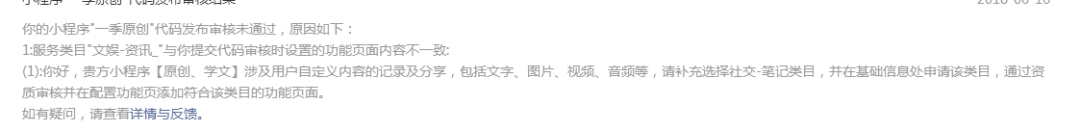 第二次主要是说 不能有用户自定义的内容 相当于发文章的只能有官方人员发表——但是之前审核都可以过,都运营一段时间了版本升级又不给过,到底是什么意思,有什么问题能不能从开始就说明.....这样会耽误几个月的时间去办理相关证书...也就是由于之前版本的bug还不能修复。。。