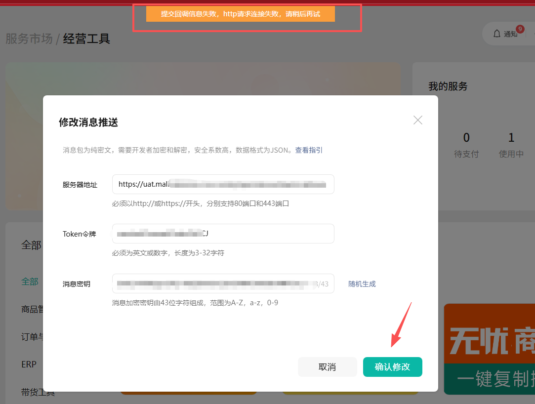 我也是遇到同样问题 设置消息推送 提交时 一直报错(提交回调信息失败.....) 但是服务器没任何响应