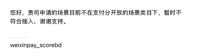 汽车租赁申请微信支付分免押金申请被拒绝,回复“您好,贵司申请的场景目前不在支付分开放的场景类目下,暂时不