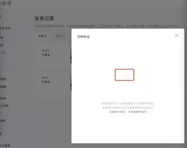 以上删除群发消息的操作是否已经过时? 现在删除群发消息时无限制的出现扫码验证,然而码一直不出现,看下图。希望能得到回复,这个问题已经多次找在线客服,机器人都没有用。