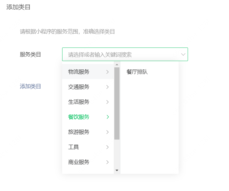 餐饮场所选不到类目,餐饮只有一个排队,那服务类目要怎么选?之前的小程序都能选到餐饮服务场所那些