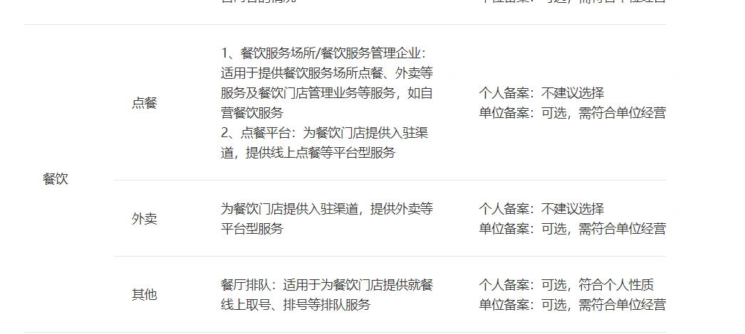 可参考“开放的服务类目”文档:https://developers.weixin.qq.com/miniprogram/product/material/#%E9%A4%90%E9%A5%AE%E6%9C%8D%E5%8A%A1