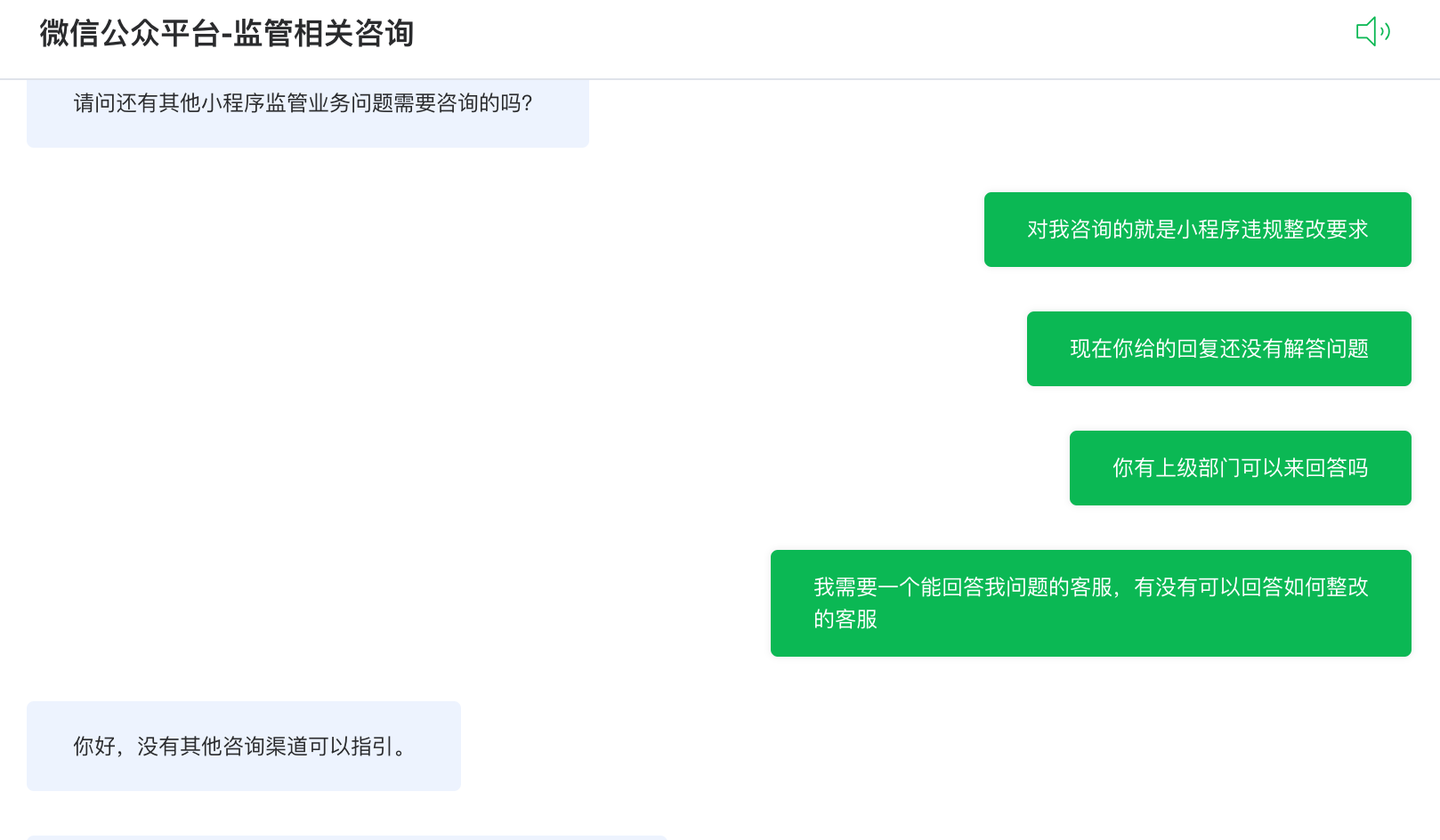 一直在发模板式回复,让给个参考的整改样例也不给,态度貌似很好,做法很官僚,无可奉告,没有,咨询了10分钟不到,在12点14分的时候,强行结束掉了会话,不知道是不是着急去吃饭。一点都不尊重小程序的开发者。