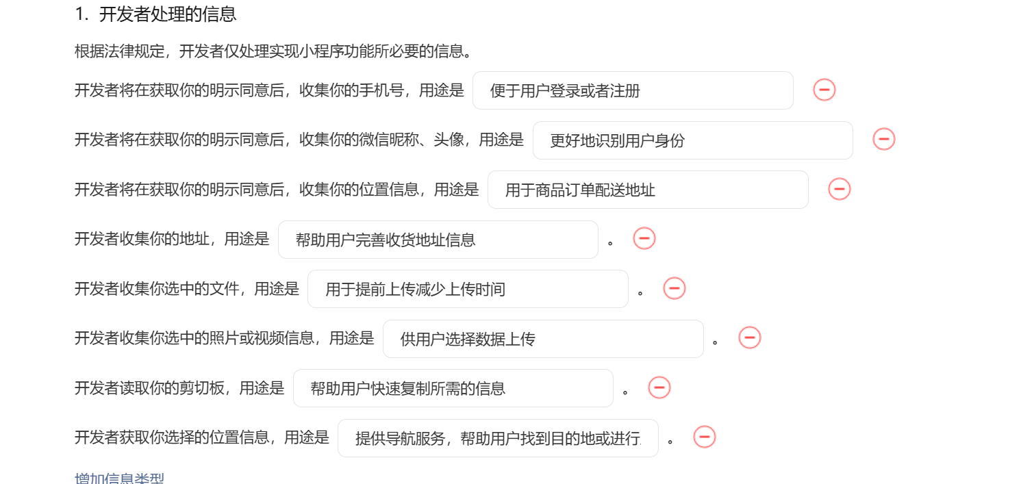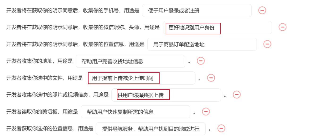 你好,建议针对不同的隐私接口分别详细描述下与其相关的具体用途后重新提交。