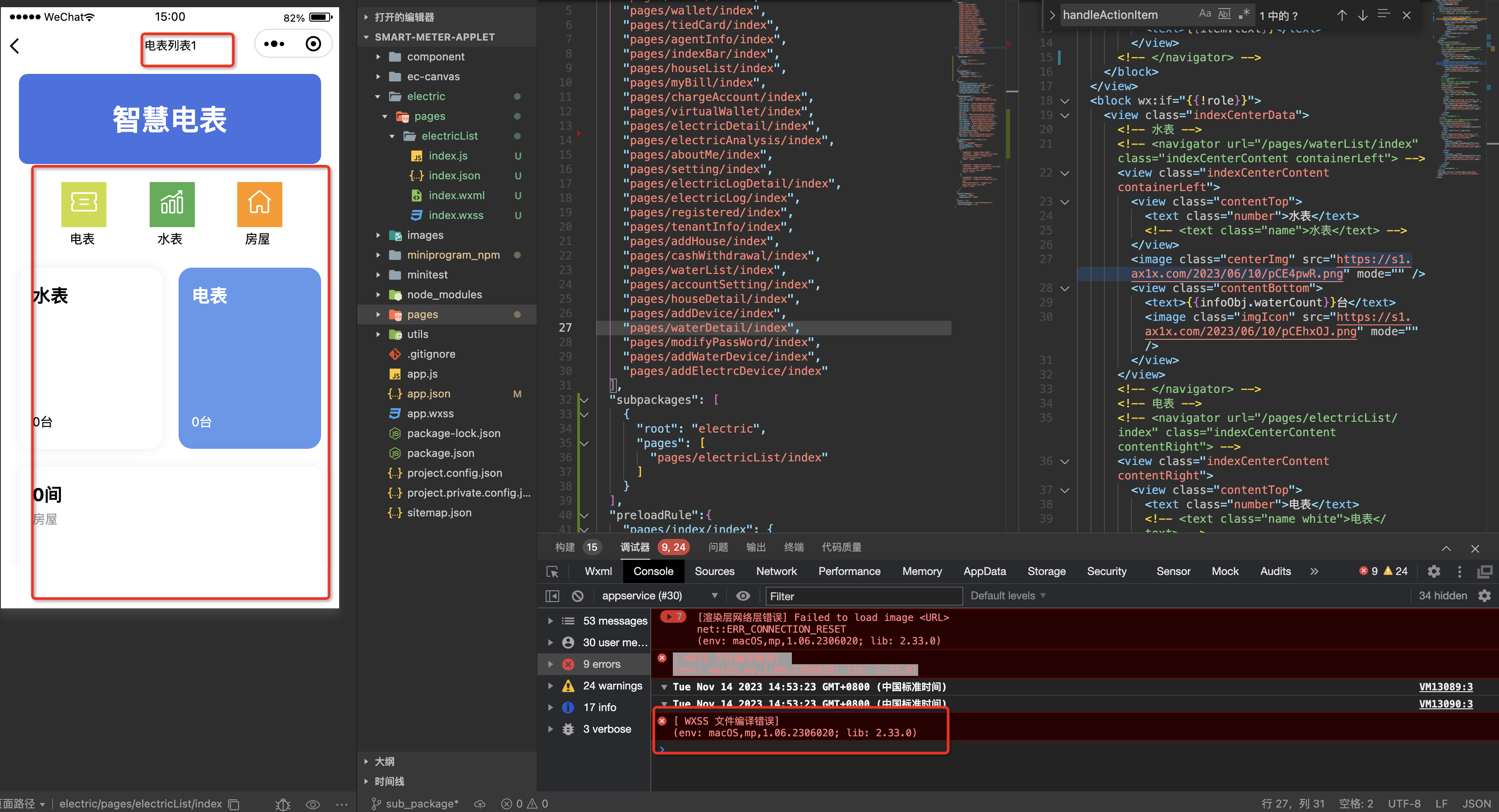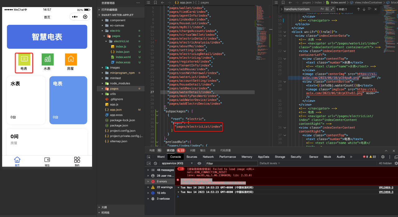 2.图2是点击了电表之后的,本来应该跳到这个电表页面,这个title变了,但是这个页面还是原来的主页的,而且电表列表里面的资源都没有被加载,编译还报错