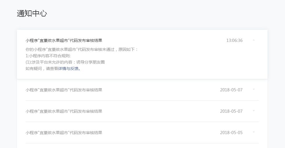 你的小程序"宜菓侬水果超市"代码发布审核未通过,原因如下:1:小程序内容不符合规则:(1):涉及平台未允许的内容:诱导分享朋友圈