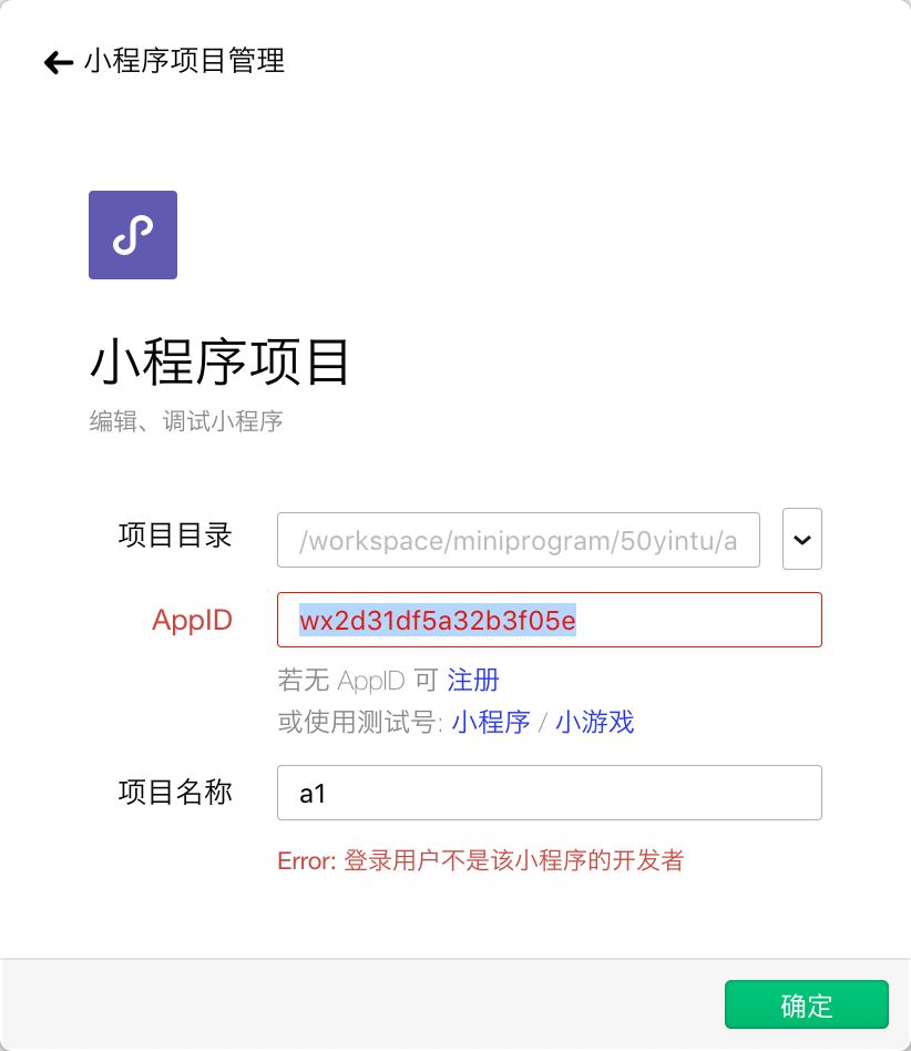 你好 我点的是这个按钮获取到的测试号的APPID 确定的时候 提示 登陆用户不是该小程序的开发者