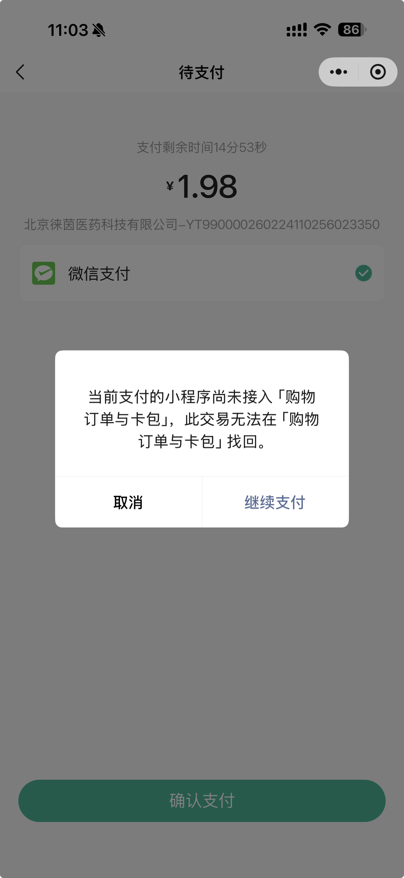 之前没有提示 现在一支付就提示这个“当前支付的小程序尚未接入「购物订单与卡包」,此交易无法在「购物订单与卡包」找回。”