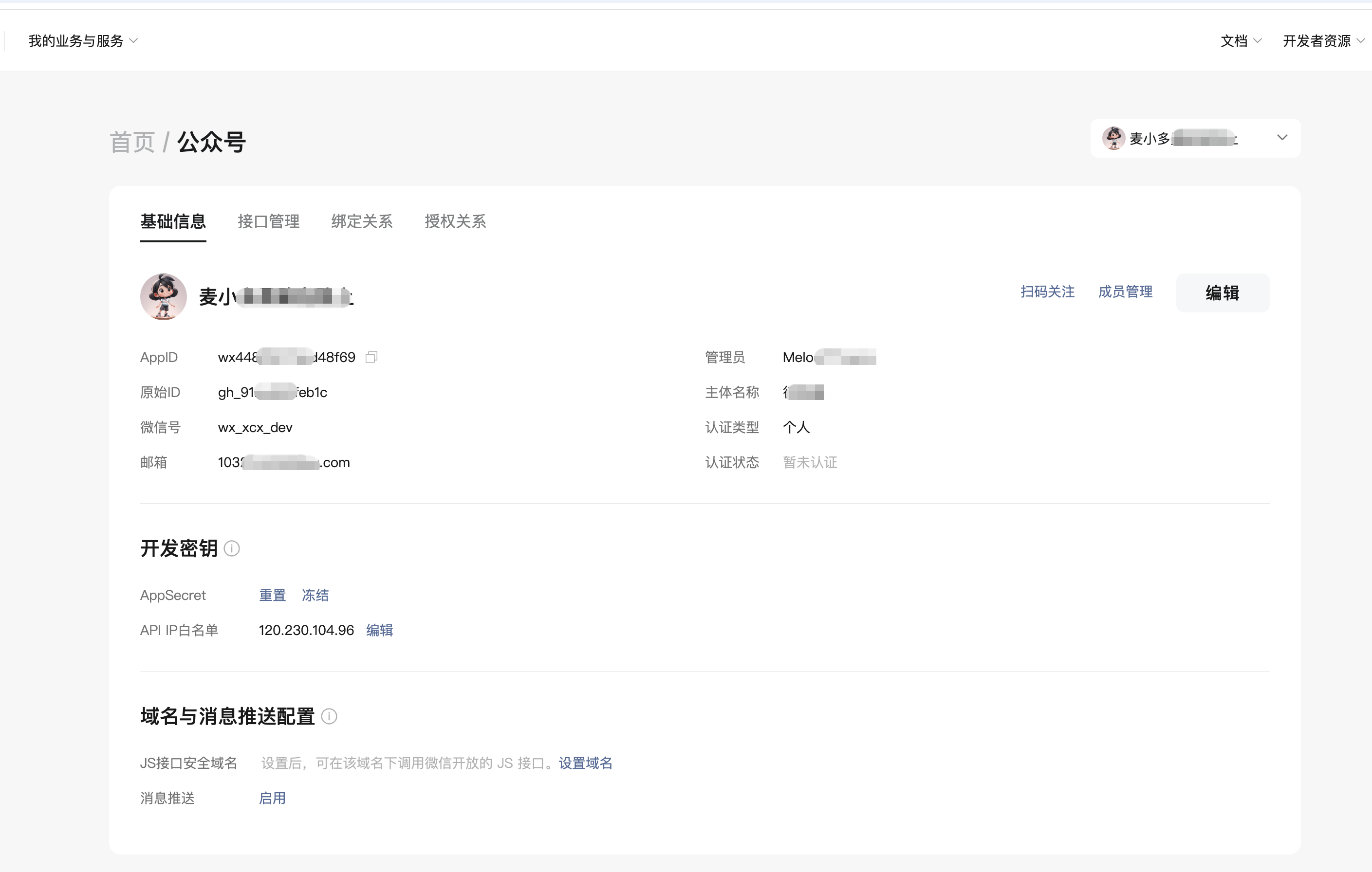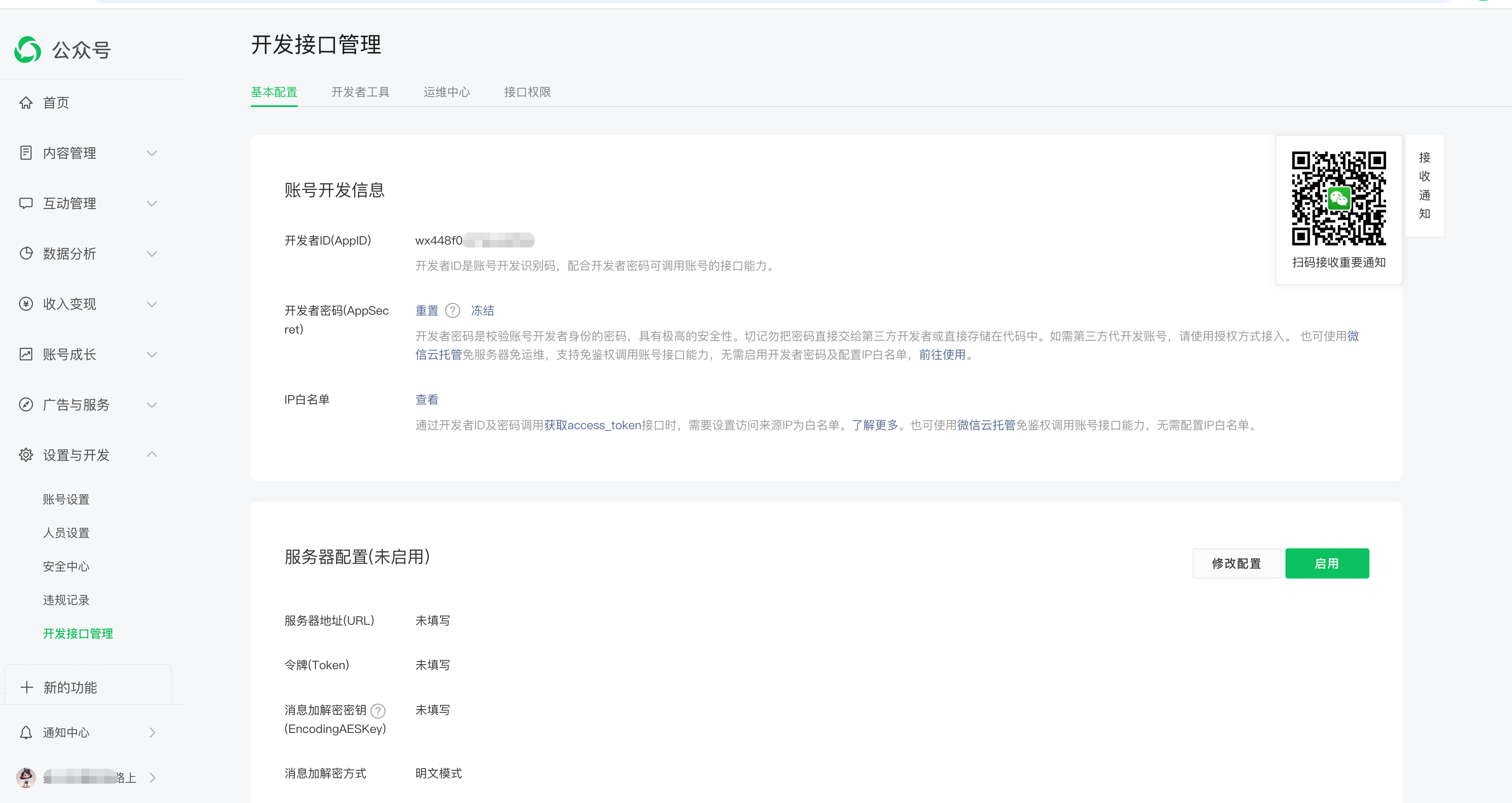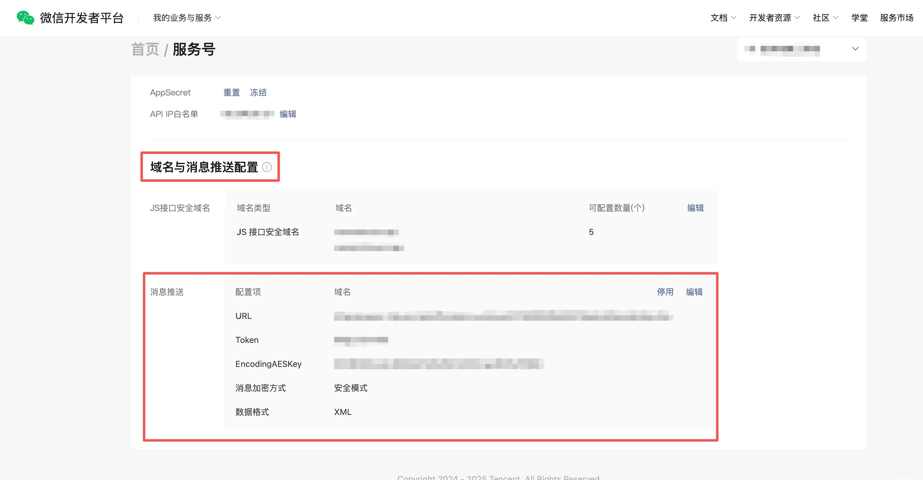 可以扫码登录微信开发者平台 https://developers.weixin.qq.com/platform -> “我的业务与服务”下的“公众号”或“服务号” -> 基础信息 -> 域名与消息推送配置 -> 消息推送 这里进行操作。