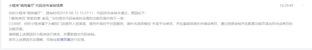 你好,经核实,贵方小程序属于为餐饮门店提供入驻渠道,提供线上点餐的平台型服务,需补充选择餐饮-点餐平台类目,若不涉及配送服务,建议将配送地址相关页面去掉
