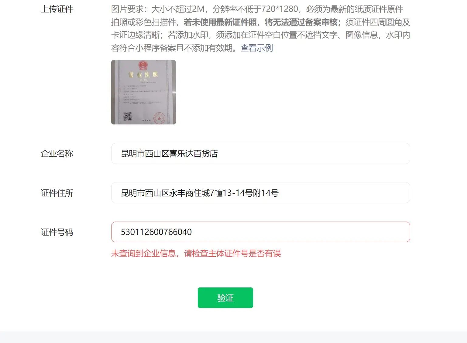 证件号码需要填写统一社会信用代码,若没有,请联系办证机构更新证件信息