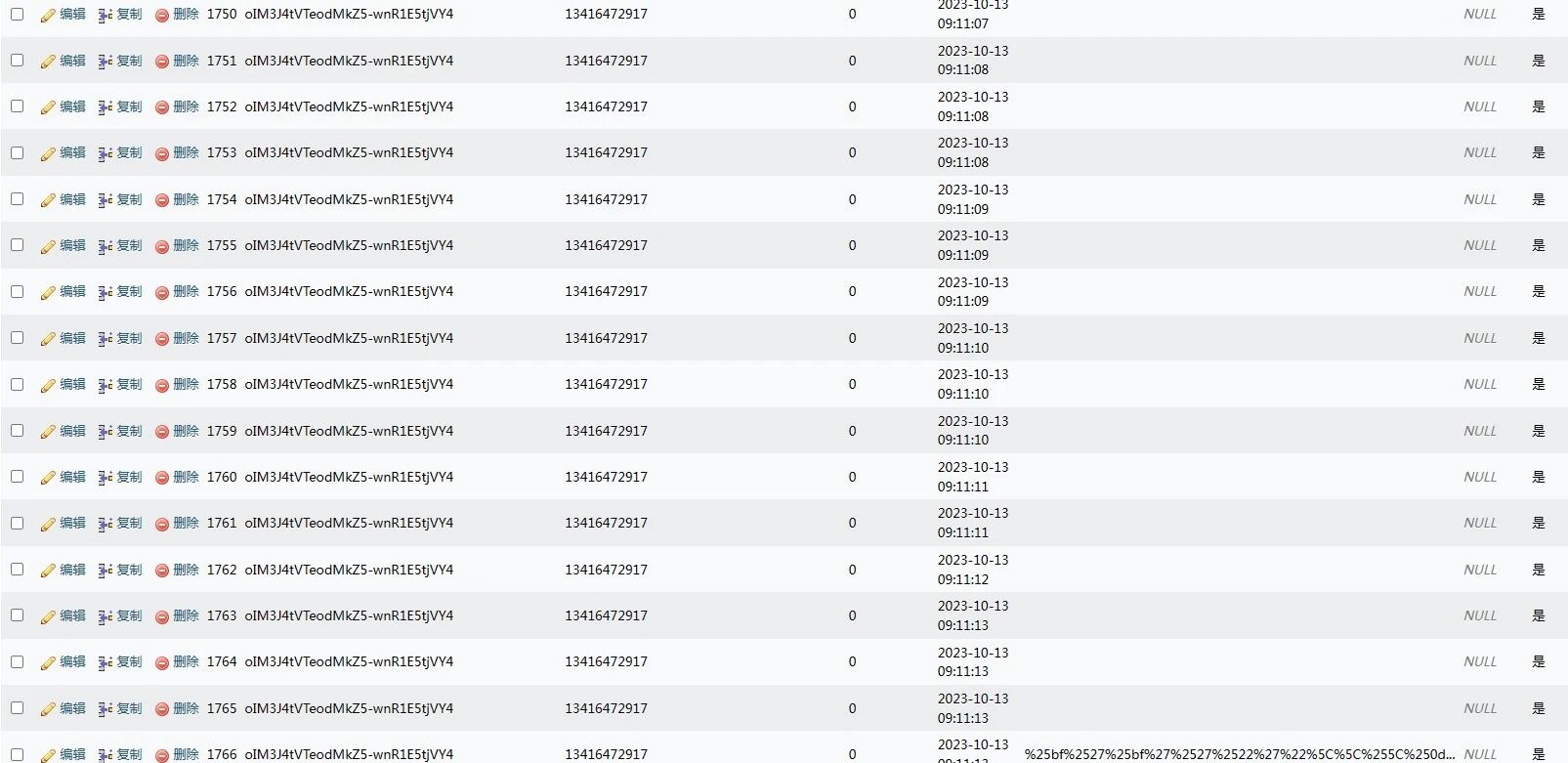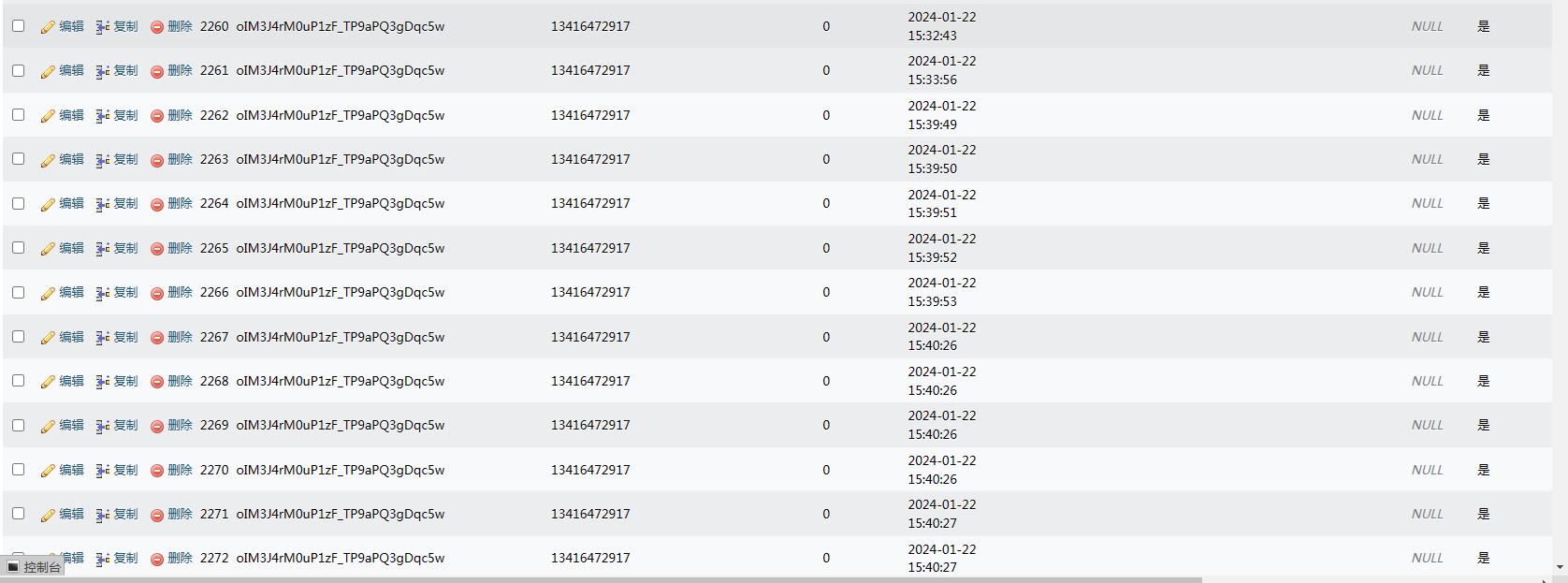 2024年1月22日又是这样,这回提交审核后多了1138个注册信息。最有意思的是,我14:05提交审核,14:19微信“服务通知”通知我“代码发布已通过审核”。15:27我发布的小程序。就在15:32:43时开始注册了第一条会员信息,平均2、3秒一个,一直到16:44分,共注册了1138条会员信息,都通过审核了,怎么还测试呢,还注册这么多信息?嘎哈呢啊?