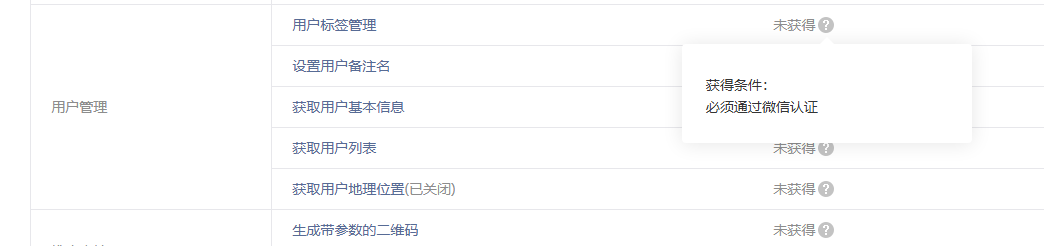 你的账号目前只是进行了个人认证,并未进行微信认证。个人号目前可以个人认证和微信认证,个人认证无法获得这些能力,必须进行微信认证(需支付认证费用)