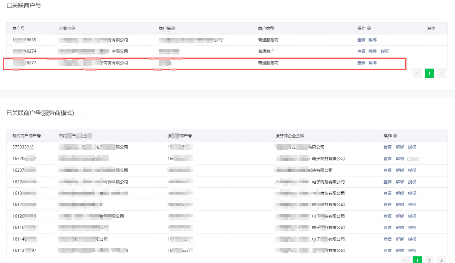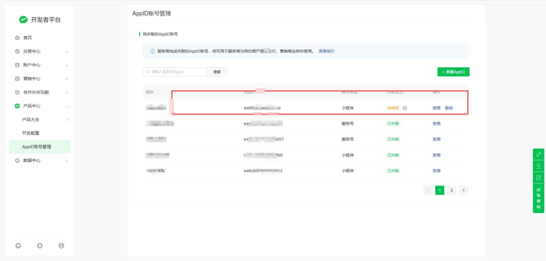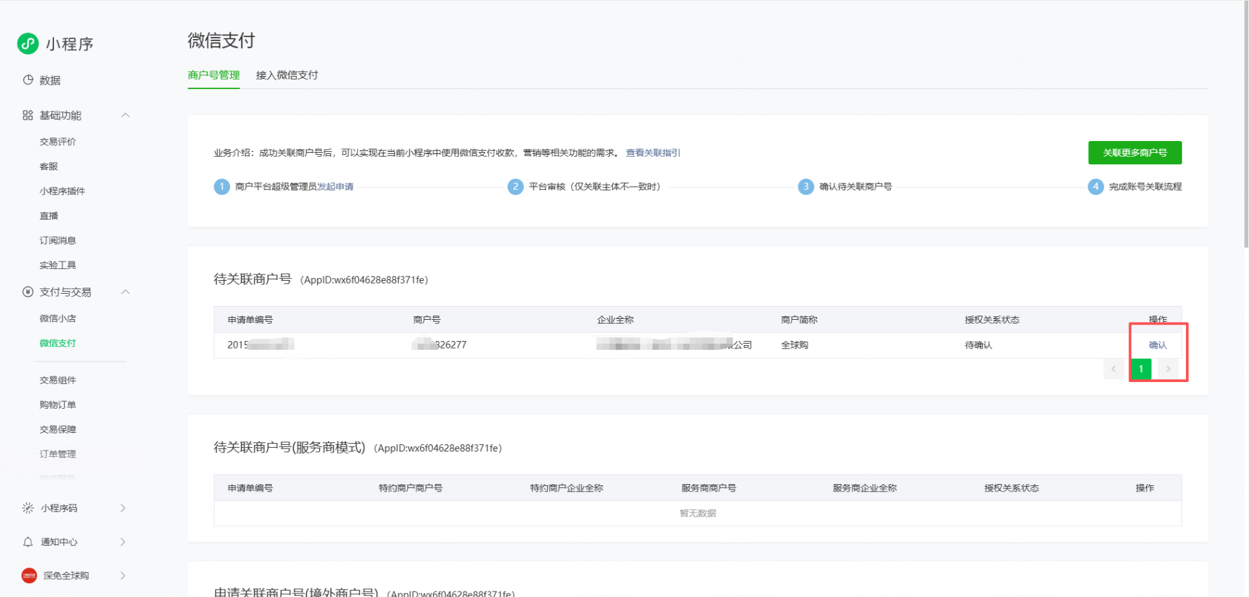 原小程序后台界面,是有绑定这个6277商户号的,误操作解绑定后,登录6277的服务商模式商家后台,添加关联appId重新进行绑定