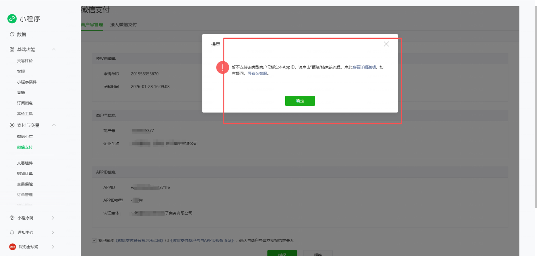 点击确认,进入这个页面,点击授权,提示暂不支持该类型商户号绑定本AppID