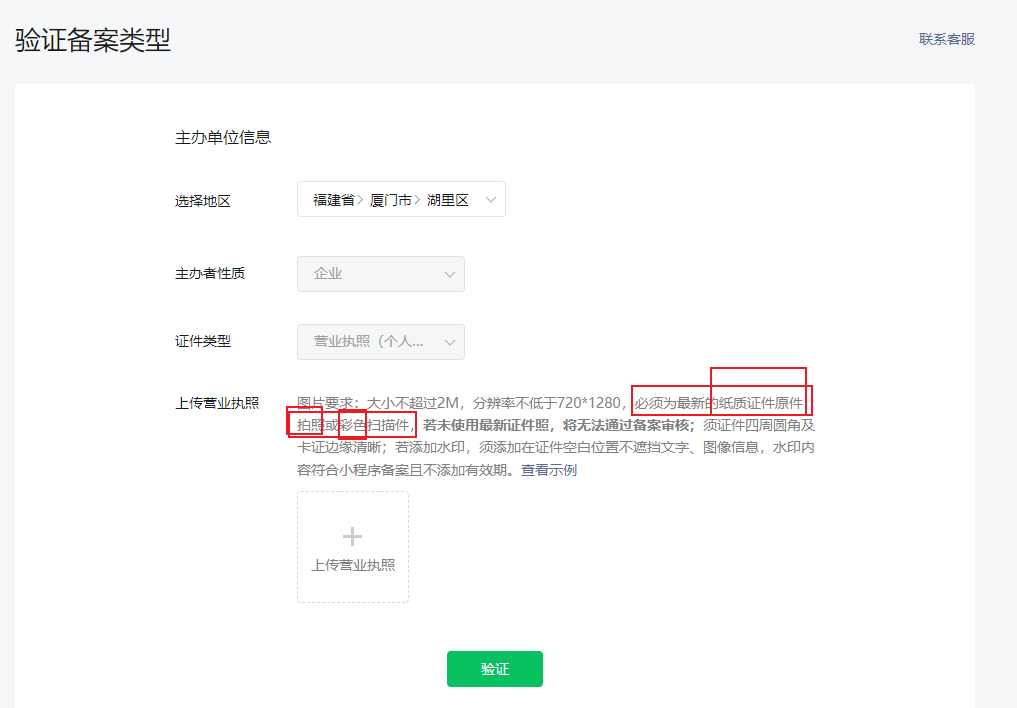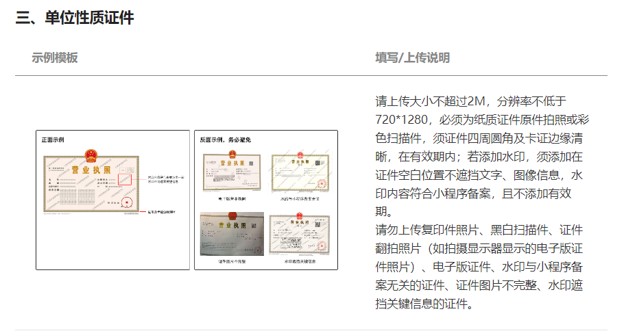 “请勿上传复印件照片、黑白扫描件、证件翻拍照片(如拍摄显示器显示的电子版证件照片)、电子版证件、水印与小程序备案无关的证件、证件图片不完整、水印遮挡关键信息的证件。”