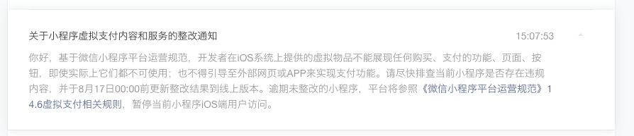 你好,关于虚拟支付,详见:《微信小程序平台运营规范》 14.6 ,请参考规范进行整改