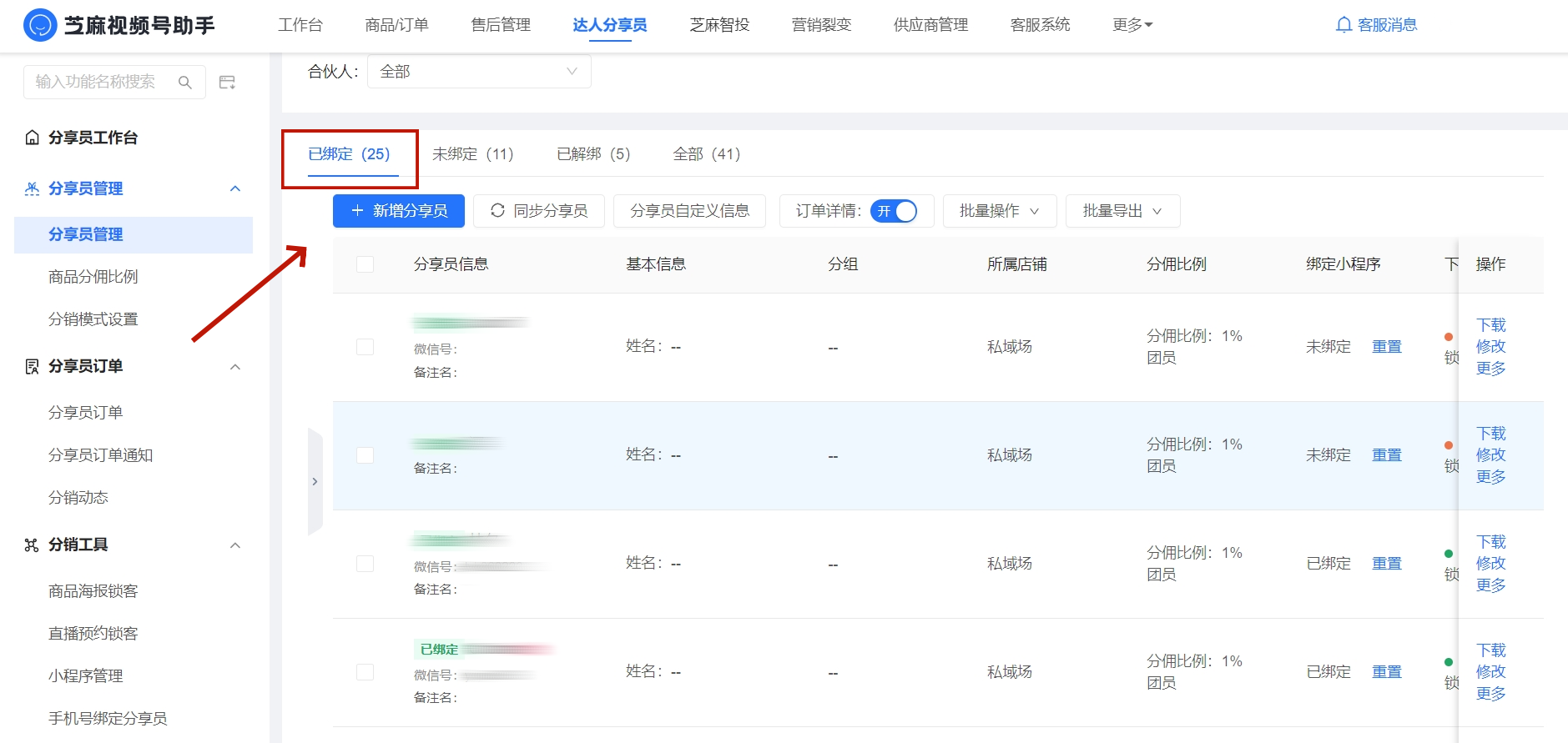 如果你使用的是芝麻视频号助手的分享员功能,你可以在芝麻视频号助手的后台【达人分享员】-【分享员管理】中已绑定的分享员中进行查看。