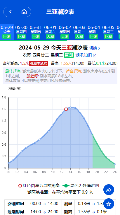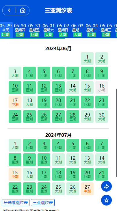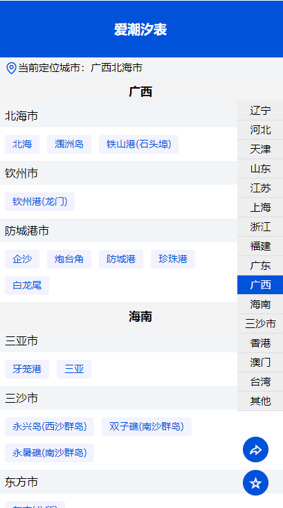 爱潮汐表提供全国海域港口未来60天内实时潮汐数据查询预测,为赶海,钓鱼,捕鱼等人员提供可靠有用的潮汐时间表数据。