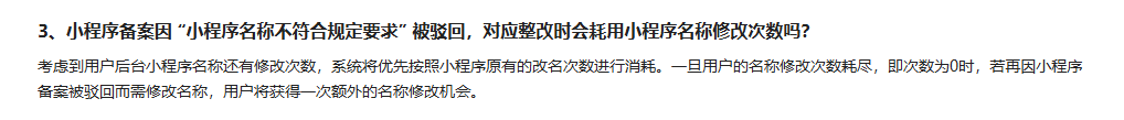 你好,当前小程序appid:wx3eb8f1f3db777858 备案已通过管局审核,关于小程序备案驳回名称不符合要求次数问题,若小程序账号还有修改次数,会先按照小程序有的改名次数消耗,在消耗完名称修改次数后,提交备案被驳回需修改名称,可以获得一次名称修改的机会