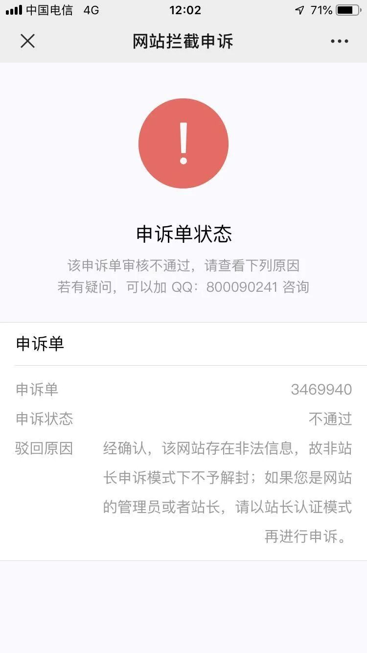 重庆市美容美发行业协会是一个官方协会,我们的官网网址是www.cqmry.org,之前可能因为员工操作不当,该官网地址在微信中被封,现在我们的新网站已经上线,绝无非法信息,但是我们发起站长申诉和非站长申诉均告失败,站长申诉过程中多次验证不通过,系统无法找到已经放在根目录下面的那个txt文件(http://cqmry.org/tencent3710995042826352384.txt)- 请看截屏,麻烦看一下我们这个申诉的具体情况,并告知下一步该怎么操作。非常着急,万分感谢!