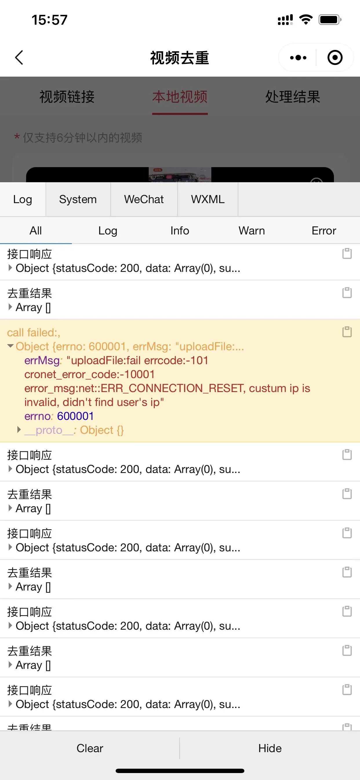 IOS上传视频文件失败,IOS版本1.50,微信版本8.0.26, 微信号jj45029548, 微信日志(8月17日)已上传