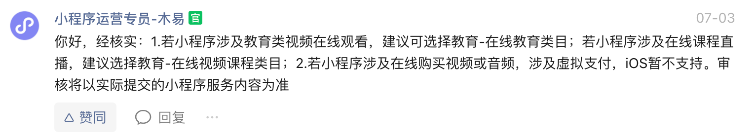 (1):你好,你的小程序涉及提供在线观看教育类视频、课程直播等服务,请补充选择:教育-在线视频课程类目。