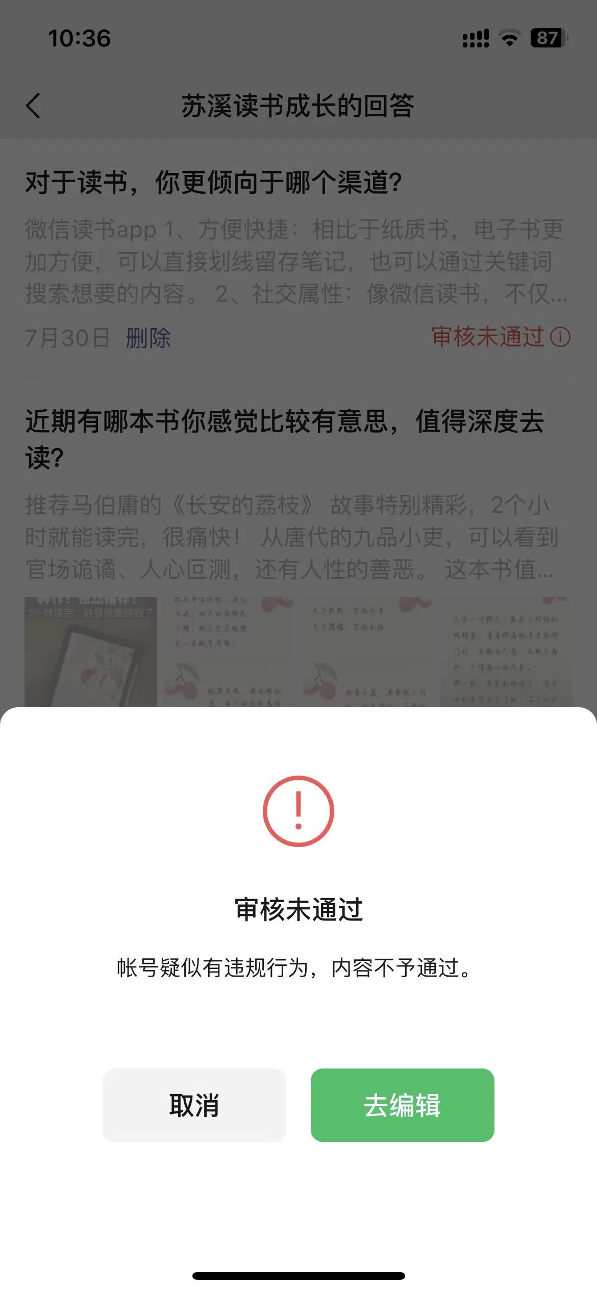 使用微信问一问回答问题后,“账号疑似有违规行为,内容不予通过”。是为什么呢?