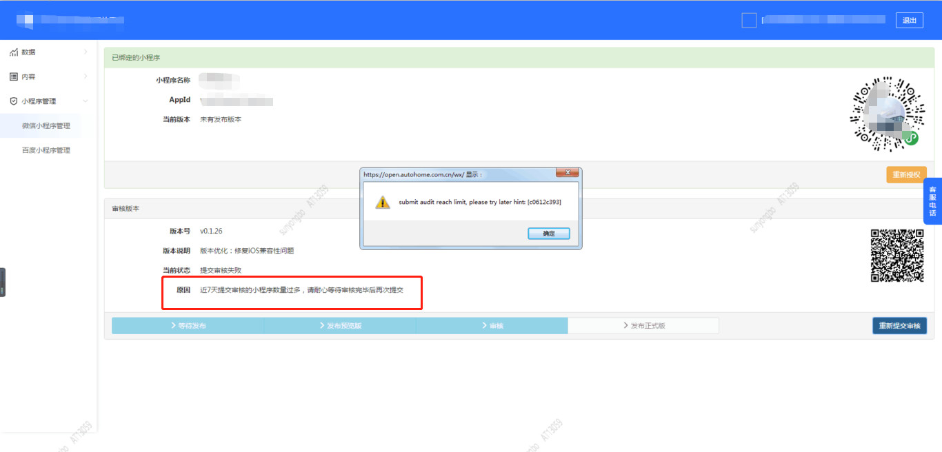 第三方平台,现在拓展客户,批量提审的小程序比较多。但是总会出现刚提审即返回