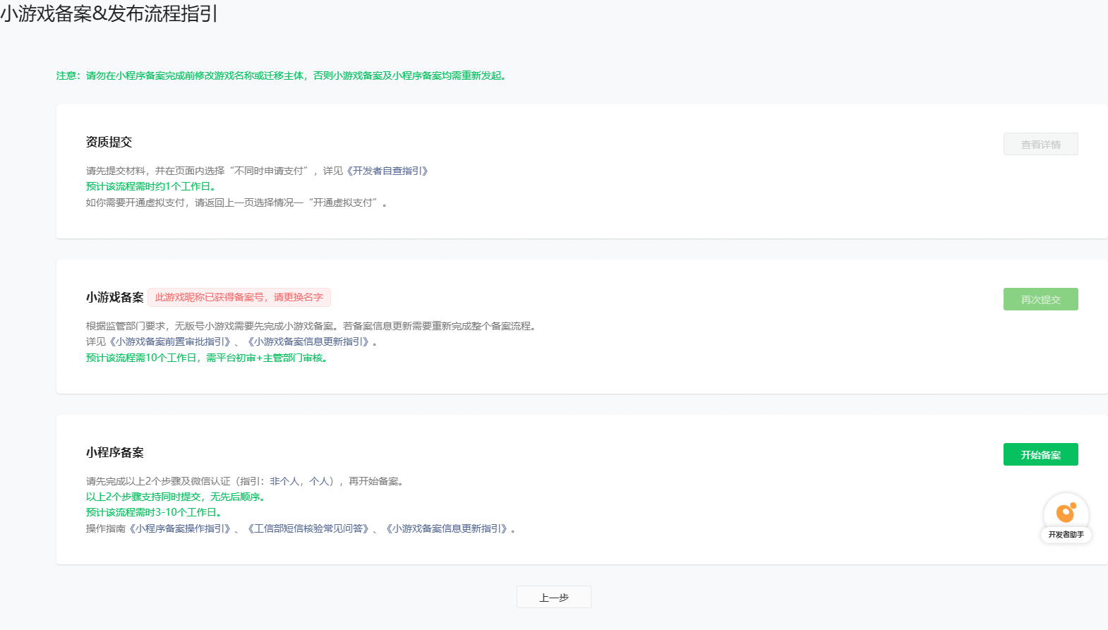 当前的背景是,原本我在公司主体B中注册了小游戏并且申请了备案, 后面由于业务调整,公司主体B发起了账户注销,在注销过程中,用个人主体A注册了同名的小游戏(先把主体B的小游戏名称修改成了其它,主体A才申请到的同名小游戏名称,但是主体B没有重新备案)。由于主体B的审核比主体B的注销要快,主体B经过审核,管局驳回,提示“此游戏昵称已获得备案号,请更换名字”,并且“再次提交”按钮置灰不可点击。