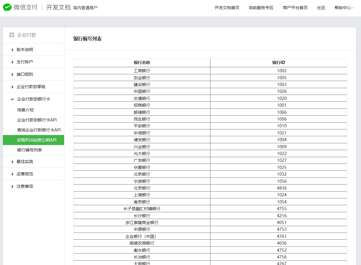 前端时间做了微信企业转账的功能,但是出现一个很致命的问题就是第三方的银行卡接口返回的银行信息与微信提供的银行信息不匹配,并且存在很大一部分不支持的银行,导致出现转账失败的案例,并且微信端支持的银行信息在持续更新,最初我添加的只有十几个,很少很少,但是过了几个月之后发现又添加了十几二十个,查找微信官方文档但是并没有银行卡编码的接口,只有一个列表,不知道是我没有找到还是微信端并没有提供出来,希望微信官方能帮我解答一下